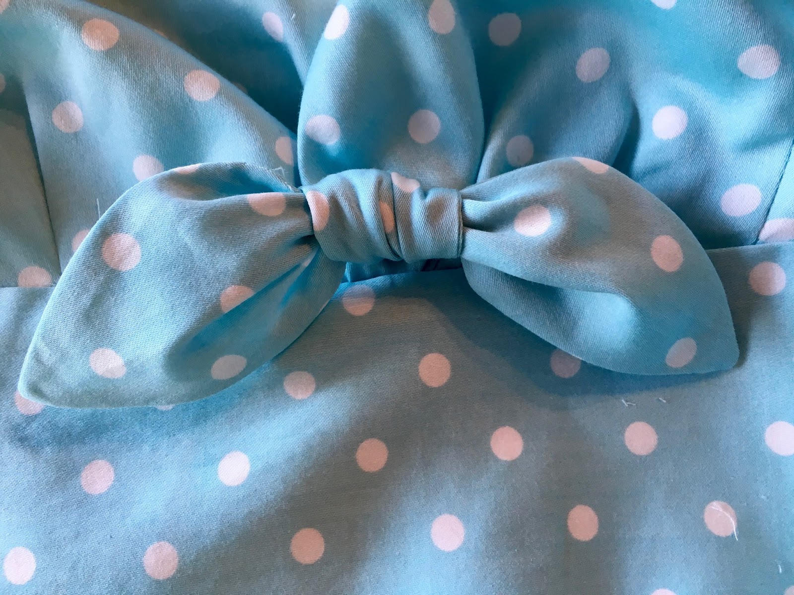I have an undying love for puff sleeves!I also added a little knot-style bow at the bust. To do this, I made two fabric rectangles that were 4" x 12" and then made points at either end. Sew the two rectangles together using a 1/4" seam allowance, leaving a hole to turn right side out. Turn, press, and hand sew the hole closed.