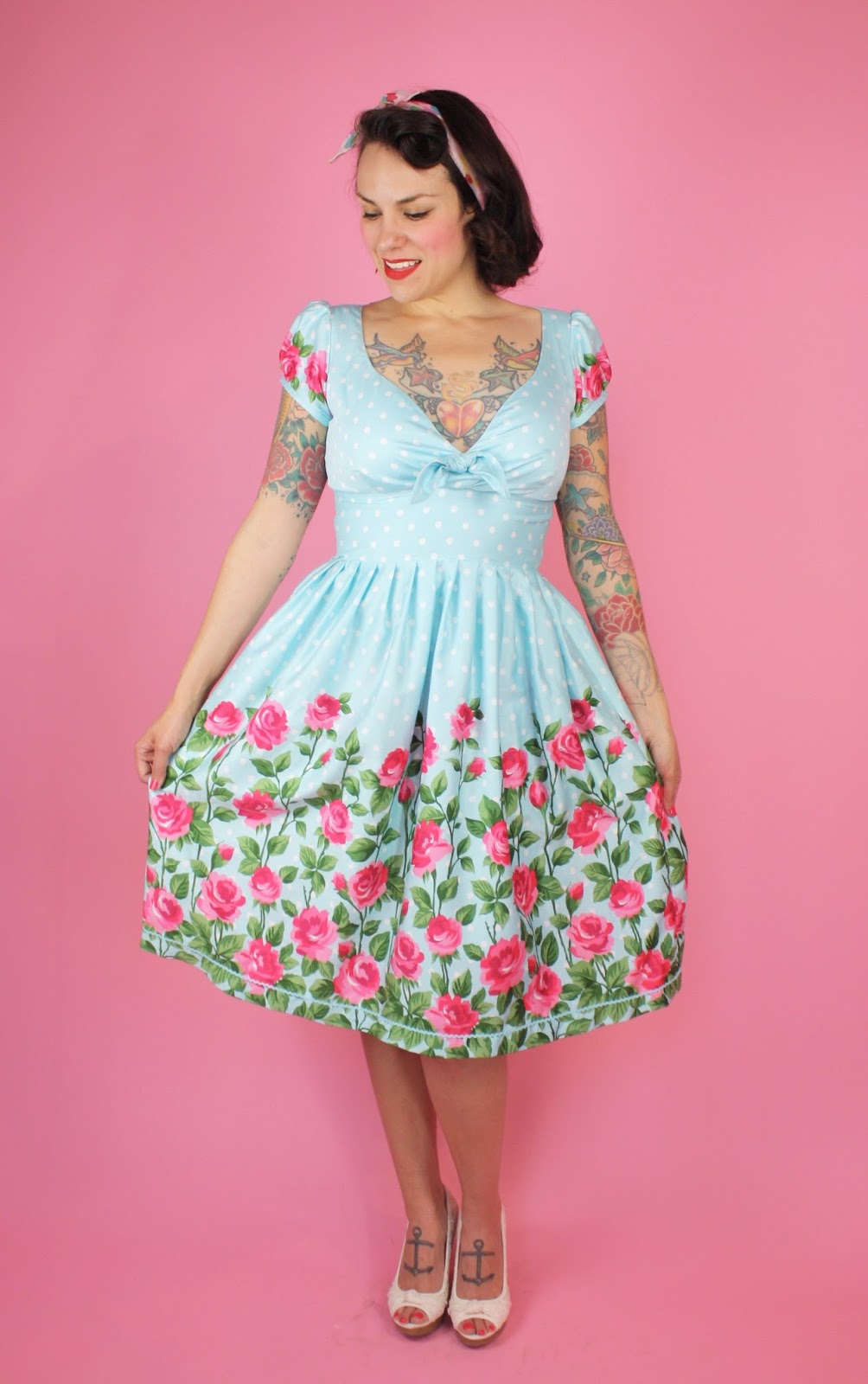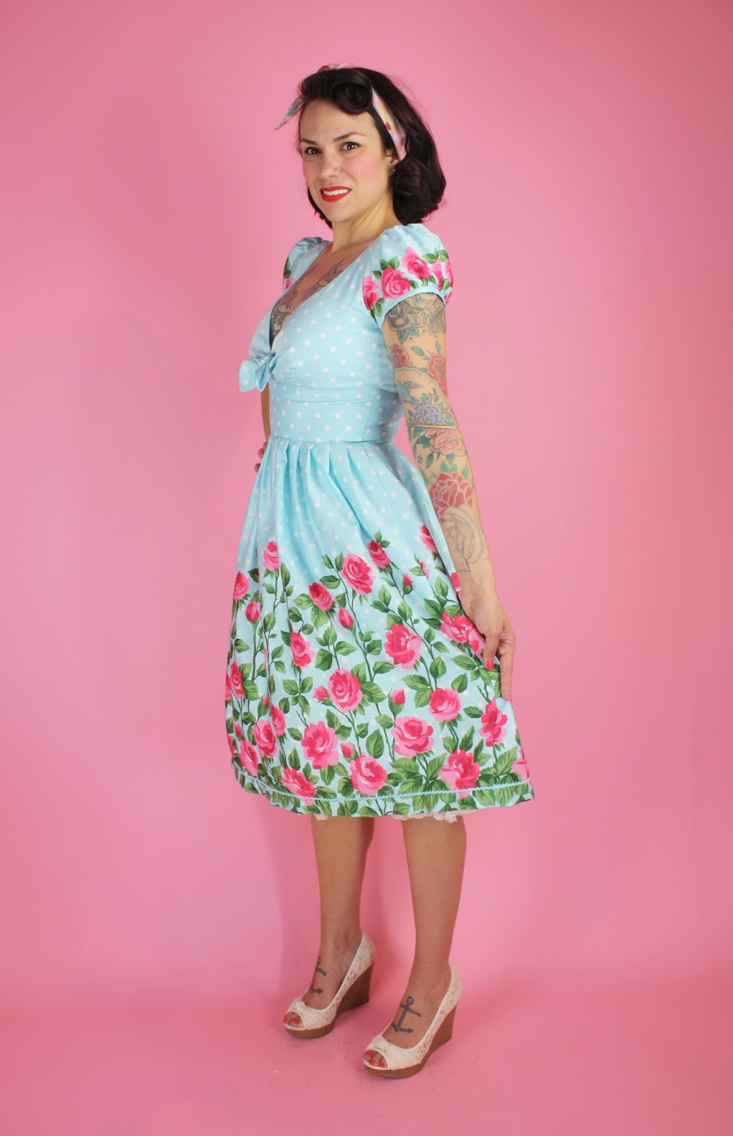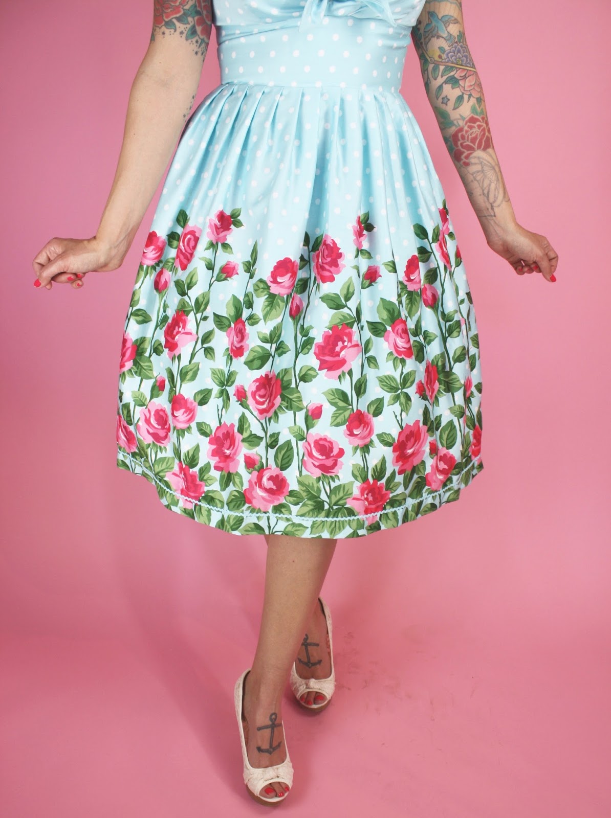 As you can see, there are actually two borders on this fabric! There's a small scale rose border on one selvage, and a big one on the other. This means you can use the different scales for different effects in your garment. For this dress, I decided to use the small border along a puff sleeve and the large border on the skirt.
