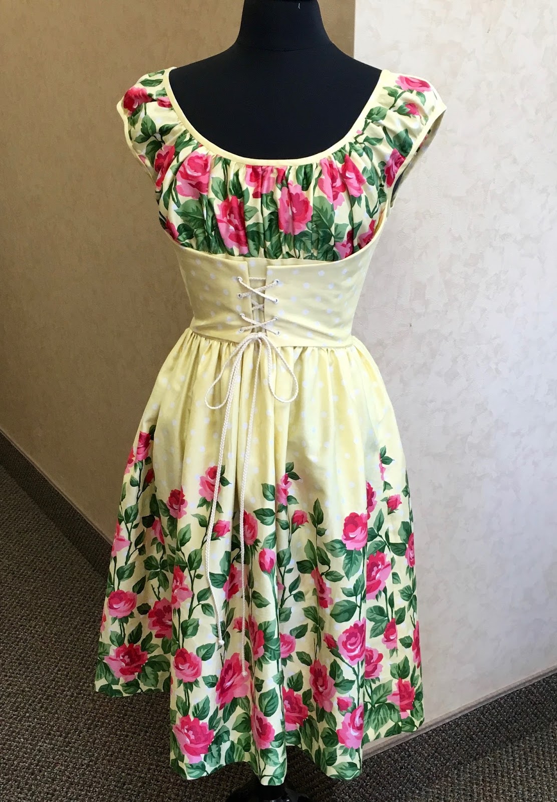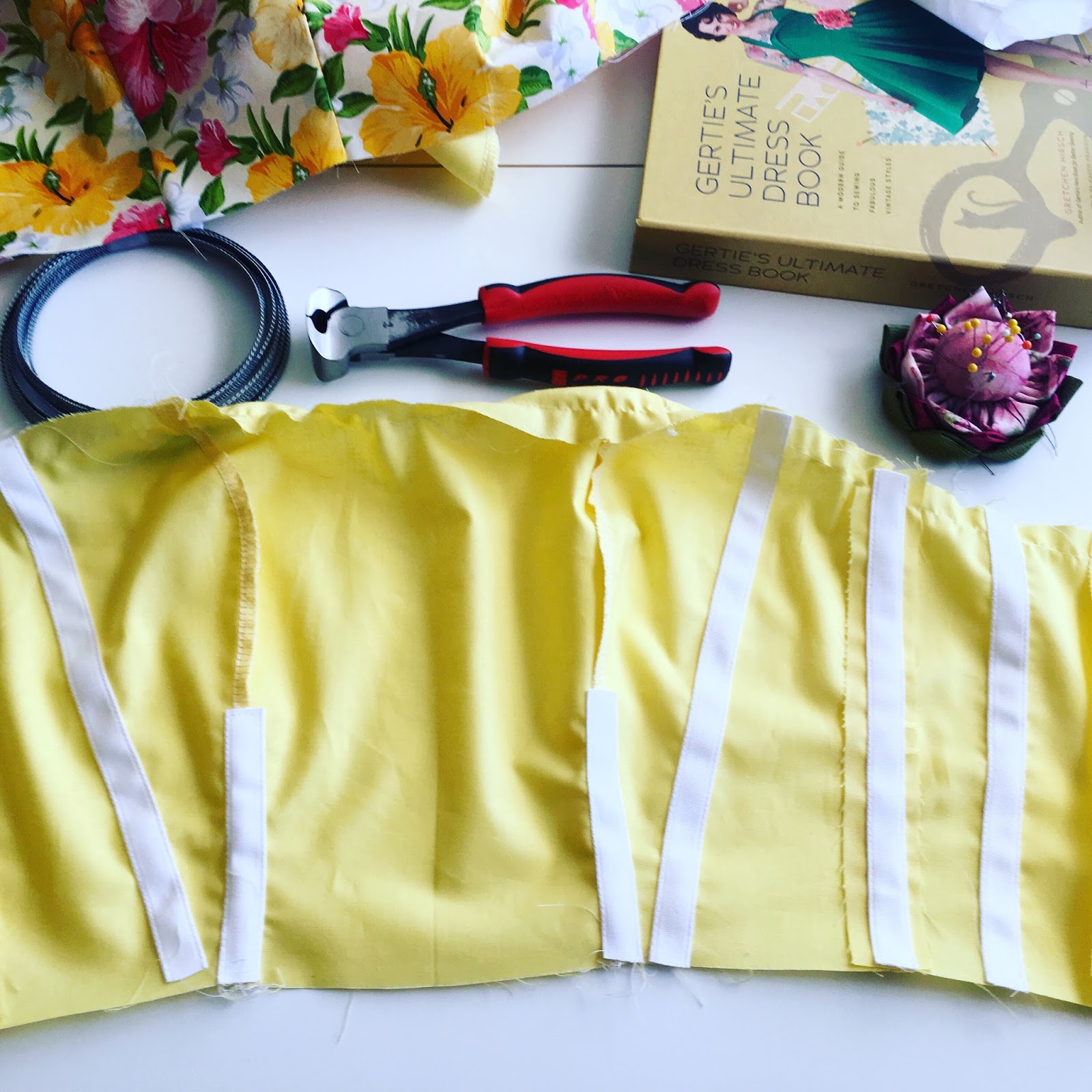 The construction is almost exactly what's described in the book, including a full lining. I used a lovely sunny yellow Kona cotton for the lining. The bodice is fully boned for support. Here it is in progress!
