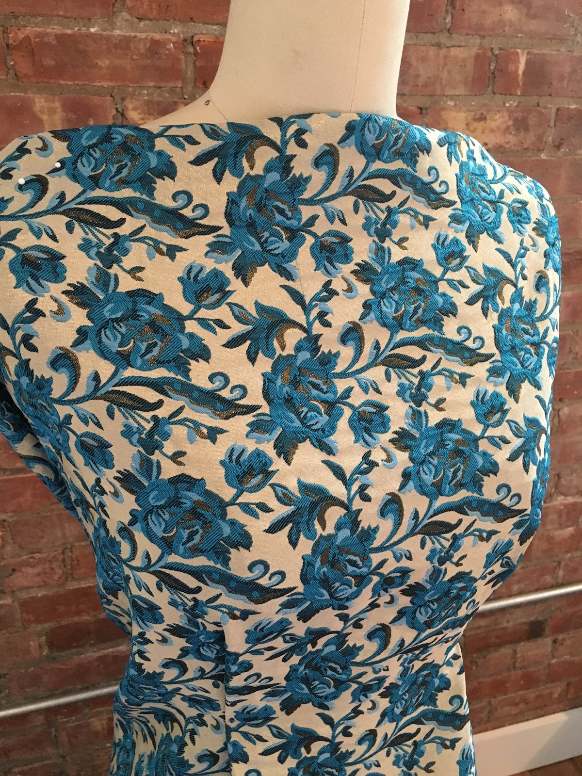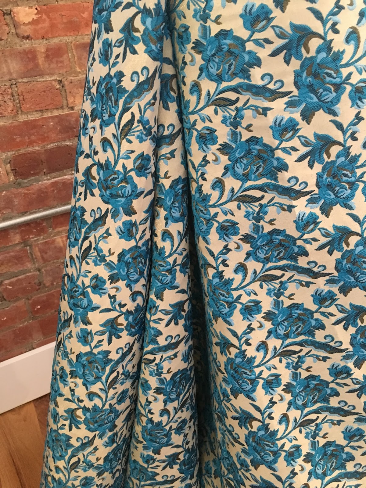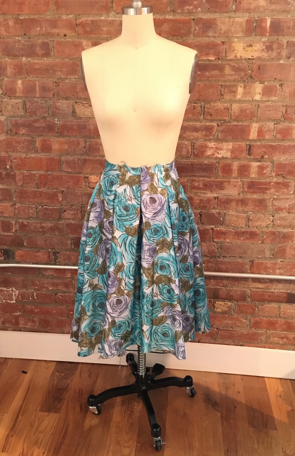Aqua Printed Floral SatinI already have this cut out for a dress! Here's the skirt, so you can see how it looks on the form. This is the box-pleated circle skirt from my dress book. It has a lot of drape to it; it just hangs beautifully.This one was inspired by those great floral satin dresses from Mad Men.