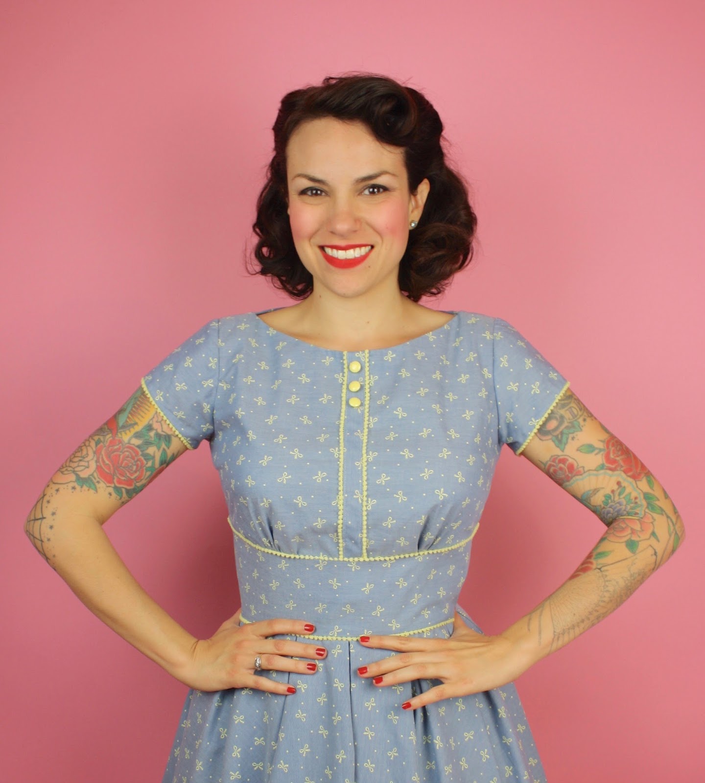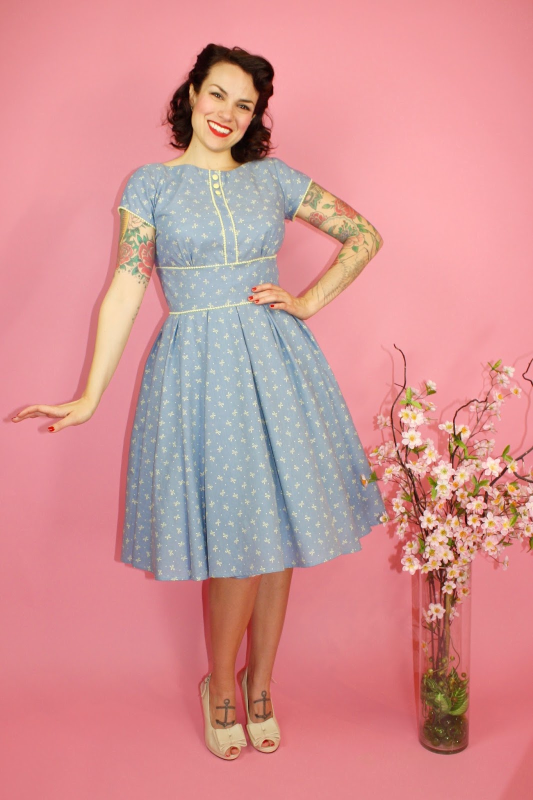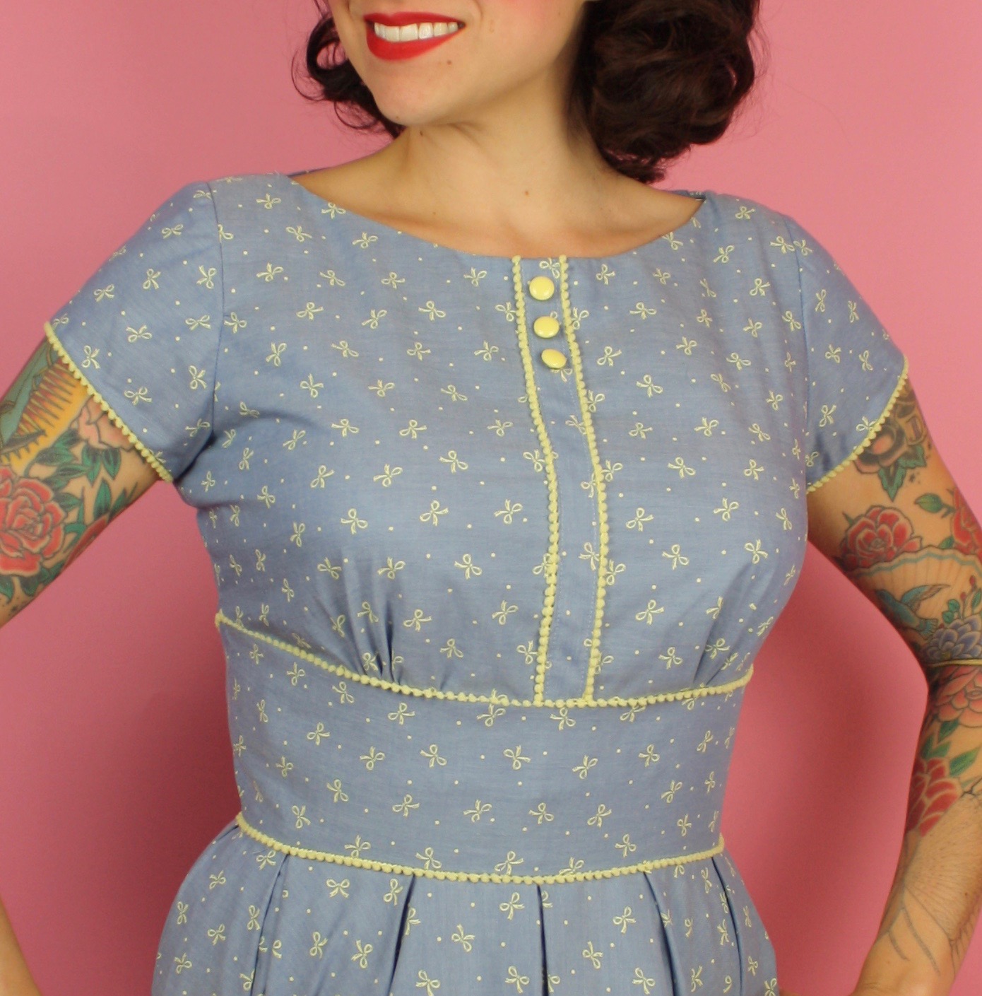 Here's another dress from my mother-daughter sewing extravaganza! This is a new dress design using the patterns in Gertie's Ultimate Dress Book, sewn up in one of my new spring fabrics from Jo-Ann Fabric and Craft Stores. This is a lovely soft chambray printed with little yellow bows!