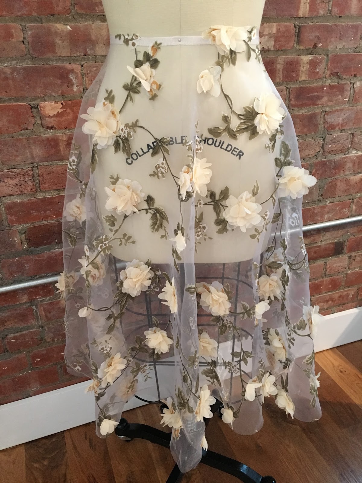 3D Blossoms on Cream OrganzaSo, here's what it is: it's an ivory organza base with an allover floral print. Then, on top of the print are stitched-on three-dimensional flowers. I cut it out in the three-quarter circle skirt pattern from my book and pinned it to a dress form.