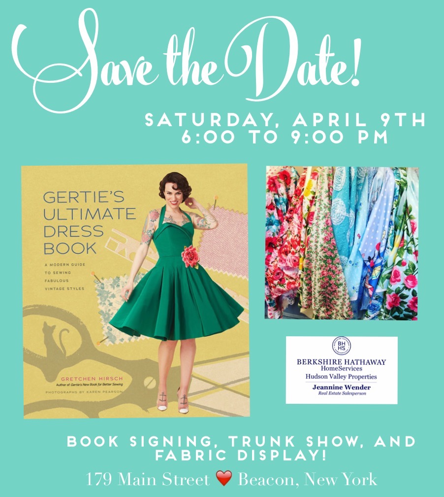 Won't you please come to my party? I'd love to have you there! As you may recall, I live in Beacon, New York, a smallish artsy town in the Hudson Valley. Every Second Saturday of the month, the shops and galleries stay open late and have special events. I love to go see the art show openings particularly. So why not do a gallery-type display of my dresses and fabric and have a book signing?Thankfully my bestie/real estate agent extraordinaire Jeannine Wender has an office space perfect for this type of show at Berkshire Hathaway right on Main Street! Please join us on Saturday, April 9th, from 6:00 to 9:00 pm. We'll be hanging dresses on the wall like paintings, and I'll have copies of Gertie's Ultimate Dress Book for signing and fabric to display as well. There will be tea and coffee and dessert. Wear your favorite dress and come say hi! Dress code: fabulous. (Or casual, whichever!)