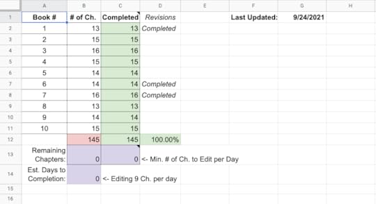 The spreadsheet for tracking the progress of an individual book.So have a way to track your progress and make a plan. It will save you time, stress, and money in the long-run.