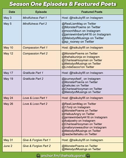The themes for the first season are: Mindfulness, Compassion, Gratitude, Love & Loss, and Give & Forgive. If you have a haiku you’ve written that fits one of these themes and want it shared on the podcast, send an email to thehaikupond (at) gmail (dot) com or leave a voice message at anchor.fm/thehaikupond/. Don’t forget your name and where to find you on social media.