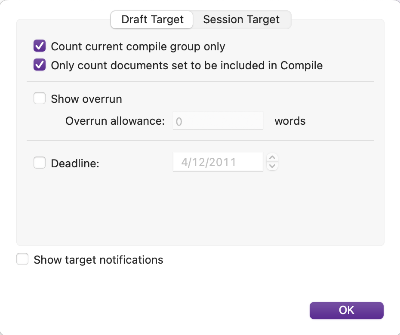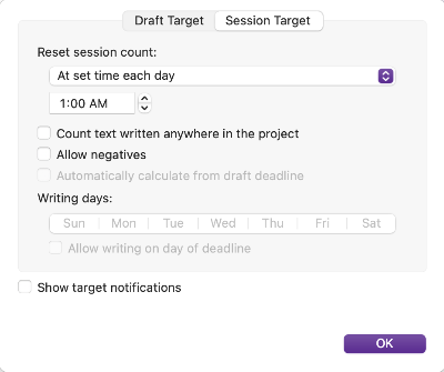 I love that Scrivener allows me to choose which days I typically write (weekdays) and then calculates my daily goal based on the number of days per week and my end date.