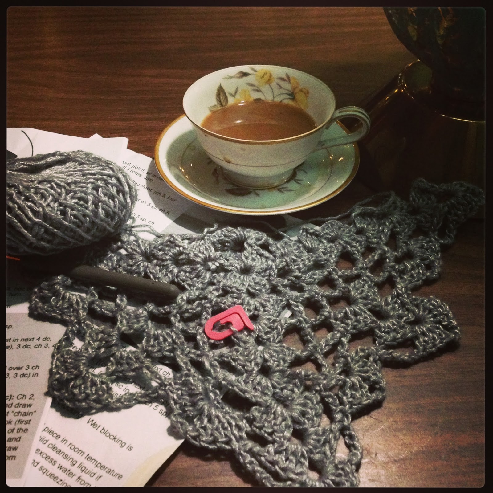 As it goes with good intentions, I started of my homage with focused dedication. See below: my metallic yarn and hook had been put to work -- they even rested nicely next to coffee served in a 1950's cup and saucer from the set my dad sent back from the war. (Lacework of any kind equals fanciness and thusly deserves to be in the company of fine China. Duh.)