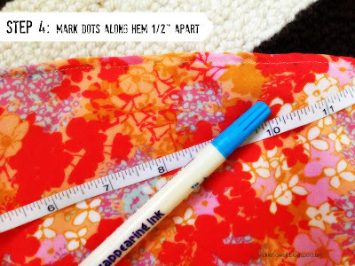 Using a measuring tape as a guide make an odd amount of dots about 1/4"/.5 cm from the top edge and 1/2"/1.25 cm apart from each other. These dots will act as your hand-sewing guide.