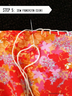 Using a strand of yarn, a tapestry needle and the blanket stitch, sew a foundation edging along the hemlines where the dots have been marked. You'll end up with an even number of gaps in between the stitches. Those gaps will be what you crochet your first row into.
