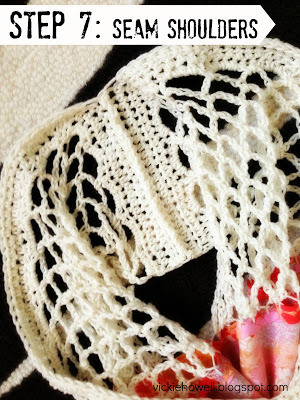 Using your preferred method (I used sc), seam together what will become the shoulders. The width of shoulders will vary based on your own body type. I have narrow shoulders so my neckline needed to be a bit smaller, so I seamed more than someone wider shoulders might. I'd say about 4"-5"/10 cm-12.5 cm for each seam should suffice.