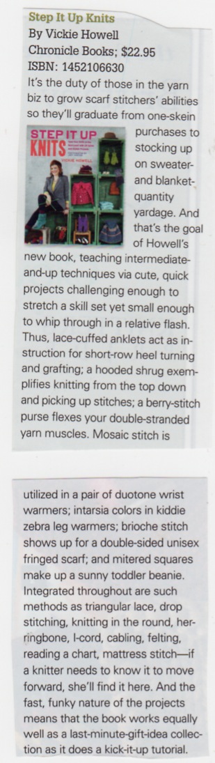 It's pretty cool to get a copy of industry mag, Yarn Market News in the mail and see the cover emblazoned with the title of my latest book! Ok, that's not entirely accurate. Their call to action for the yarn business-types isn't related to my book at all...but, there IS a review of Step It Up Knits in the same issue. Check it out, wontcha! Thanks!--Vic