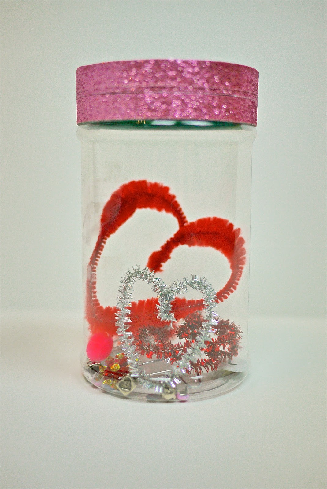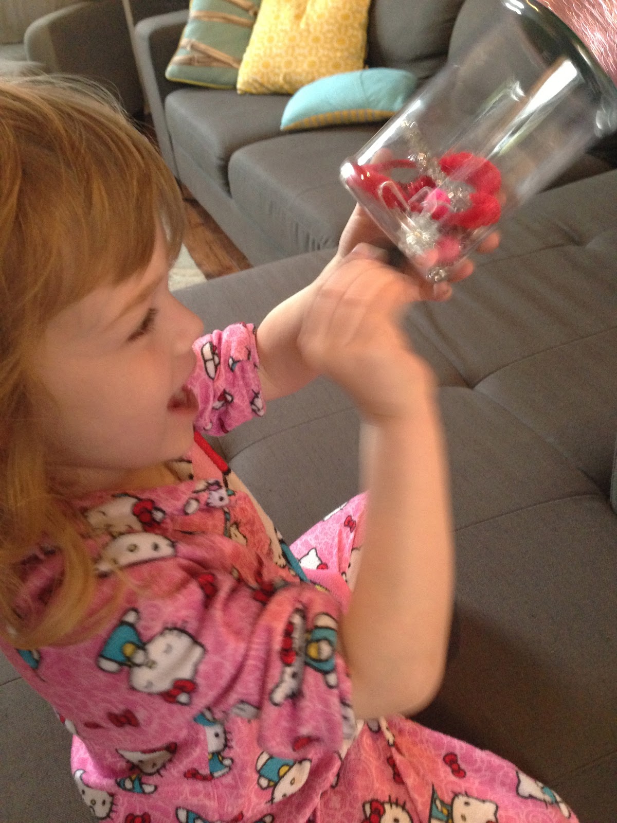 My 3 1/2 year-old daughter and I have put a couple of the pre-schooler friendly DIYdeas into action, by making out own versions. The first one was this magnet experiment. My version uses an empty peanut butter container, some glitter tape, and a bunch of Valentine-inspired items. Most items had metal in them (pipe cleaners, bells, paper clips, etc.), but others (pom poms, sequin, etc.) did not. Clover had fun seeing how the magnet worked to attract the metal items, while leaving the other items alone.