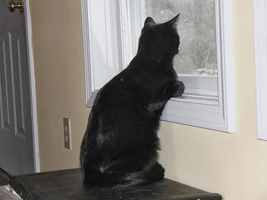 I pulled her up and brought her back into the house, put her in her crate and closed the door. Then, shaking with anger, I went back outside to see about Photon. Again I pushed through brush to where he sat on a limb, hunched up, his fur puffy and his aspect disgruntled.