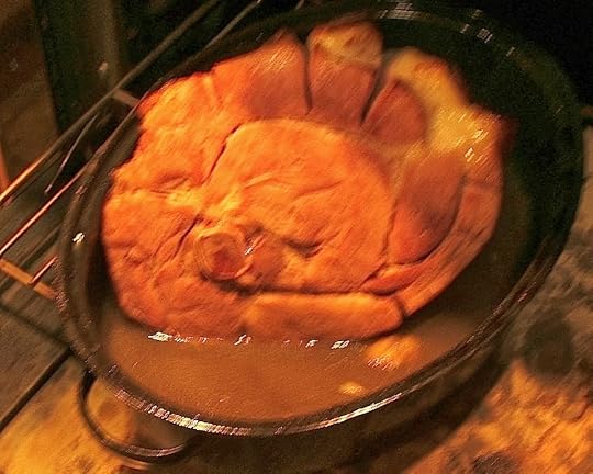This pig is drunkIngredients1 ham, shank or butt portion, about 10 pounds1/2 cup bourbon3 1/2 cups apple cider1/2 cup brown sugarPut the bourbon, cider, and brown sugar in a small pot and stir it up. Turn the heat to high and let it come to a boil. Turn it down to medium and let it simmer for about five or ten minutes, to burn off the alcohol and mellow the flavors. Heat mellows us all, If you’re from the Northeast, surely you know that.Score the ham to your preference (I don’t do diamonds, just slashes) put it in a roasting pan, its primary meat side down, and pour the liquid over it. Speaking with it courteously, tell it you’re now putting it in an oven preheated to 450 degrees.