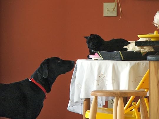 Once she was a puppy Daily bread, daily dogs and cats, and daily livingSteve and I got married shortly after we moved in to our new house, going on the theory that if we could survive building together, we could probably manage marriage. So far, it’s working out nicely. Then, of course, Steve started pining for a dog, and I chose the little black lab, daughter to Gandalf and Arwen, at Bill West’s house. Or she chose me. Either way, the day we brought her home, I got my first lesson in how to speak dog, for native cat speakers. We hadn’t named her, because it takes time for an animal to tell you its name, so she was still just Puppy. We brought her into our living room, put her down and let her sniff about. We watched, as she wagged her tail at pretty much everything. Before long, our three year old cat, Photon, entered the room. He’s one of a series of black cats who have strolled gracefully through my life. In fact, I’ve always made room for at least one black cat in my home, because they’re often last to be chosen at the shelter, and first to be used abusively in the world, which is sad. But right now, we really wanted him to keep a low profile. Clearly, he had different ideas. “I thought you put him in the Circus room,” Steve said nervously, using our name for the guest bedroom, decorated in homage to the circus house. “I did. He got out,” I answered just as nervously. I wanted to get used to the puppy before I dealt with the cat’s reaction, because I’m a little, well, let’s call it neurotic, about protecting my cats. But we’d done some work to prep him, bringing home doggie smells on a towel and so on. Maybe, I thought, it would be okay. It wasn’t. Photon padded over, made his trilling noise of greeting, then stopped and stared at the new creature in his house. The puppy turned her eager face to him. Photon glared. The puppy wagged her tail so hard her whole back end went into motion. Photon started his own tail flicking back and forth. They stood that way for a moment, two small black animals, both of them wagging their tails, mirror images of each other. Only, they each meant something very different by the gesture. Puppy, seeing a small furry black animal whose tail waved back and forth, did her play bow, then made a puppy leap. Photon, seeing an animal that wagged its tail and leaped, pushed out the ten tiny razors he kept in his paws for just such occasions, and used them. In the flying fur and yelps that followed, Steve and I frantically sorted out bodies, each of us retreating to our side of the living room with an animal in our arms. Suddenly, I felt myself burning with fury, beyond all proportion to the situation. “Watch your dog,” I hissed, hanging on to the cat. “She attacked my cat.” “Keep your cat back, before she hurts my dog,” he growled back, holding the puppy. The dog licked Steve. The cat settled into a nervous purr in my arms. Steve and I examined our animals for wounds, found none, and exchanged disapproving glances. I sniffed. “I’ll take Photon back to the Circus Room.” “Close the door this time,” he called after me as I went. I sat with Photon on the bed, and though he returned very quickly to trilling and purring, I was surprised at the emotions roiling around in me. I checked in with myself, and found simmering anger, that this interloper had disturbed my cat’s equilibrium. And how come Puppy got to take over the house, while we had to retreat? Also, quite unexpectedly, I was afraid. What if Photon got mad and ran away? And Puppy would soon be really big, if her 120 pound father was any indication of her ultimate size. What if - what if she squished the cat? Or ate it? My rational brain, my adult self, knew none of this was likely, but apparently the puppy had reached in and triggered the lock on a suitcase full of tricky old emotions. I shouldn’t have been surprised. There are almost always more tricky emotions than we want to acknowledge laying in wait for us, and animals, speaking to our wilder selves, often make them visible. Though Western thought likes to portray humans as above all that, we’re not. We relate to animals in visceral ways, not always able to articulate why we’re moved by the flight of the heron overhead, or drawn to the strange antics of squirrels in the park. Nonhuman animals hold up a mirror to our souls, teaching us who we really are. They’re incredibly generous that way, and we’d be wise to pay more attention to their lessons instead of texting so much. Cats and dogs, who live in close association with us, have also been burdened with a bunch of cultural accretions. In our minds, they’re bound up with gender metaphors, cats standing for women and dogs for men. You know what I mean. There’s that obvious reference to female anatomy associated with cats, and the way we call some men hound dogs. We also tend to privilege each along gender lines, seeing dogs as hard working, loyal and trustworthy, while cats are tricky, unpredictable, unaffectionate, or even evil. In Europe in the middle ages, the new religion of Catholicism went through village after village, burning even more cats than women because they were associated with goddess worship, and female witches. In fact, they burned so many cats the species almost went extinct. But then, the rat population grew, and the plague killed more than half the human population as well.