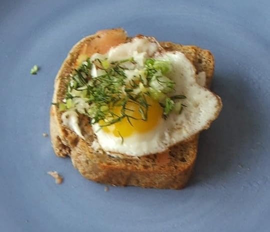 Because no two dogs or eggs are alike, I also did this with a slice of smoked salmon, covering the egg with dill and finely chopped scallion. Also YUM!