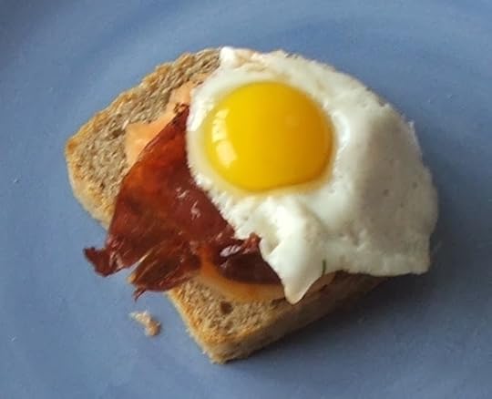 Two eggsThis recipe calls for quail eggs. If you can't find them, use really small eggs. The smallest you can find. But do search for quail eggs, because they're beautiful, and tiny. I use them in lots of different ways, and this is just one of them. Slices of small loaves, preferably rye (I use my homemade rye and blue cheese bread, a recipe I'll offer at a later date.)Quail eggs or really small eggsSlices of papayaSlices of prosciutto
