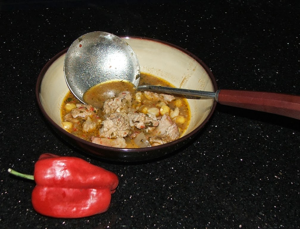 About an hour before it’s time to take it off, add the onions and orange or red peppers, and the hominy or chicos. Let it finish its job of cooking.