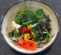 About 5 springs of fresh frilly dill ferns, picked from the stem but NOT choppedAbout 7 Basil leaves, sliced in chiffonadeAbout 10 nasturtium blossoms, whole and singingAbout 10 lemon gem marigold blossoms, and maybe about the same of their frilly, ferny leaves, NOT chopped