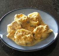 When they’re done, get them out of the water and put them in a bowl - but SAVE SOME OF THE COOKING WATER!. Check your sauce and if it seems too thick, add some pasta water. Then smother your little tortellinis with the sauce, get a bowl and fork and enjoy!