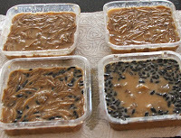 Stir it up, let it cool a little bit, and pour it into flat molds of your choosing that will fit in your suet feeder. I use the leftover containers from store-bought suet. You could use just about any mold that’s about the same flatness.