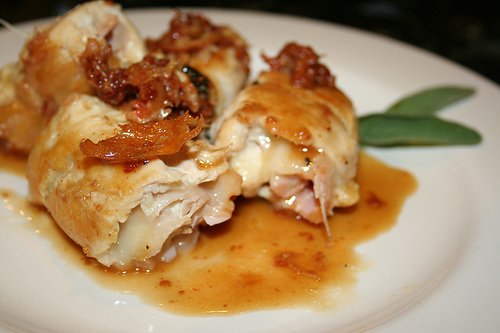 DirectionsSeason the flour with salt and pepper. Add the dried sage and grated cheese.Heat the oil in a pan and throw the sage leaves in when it’s good and hot. Let it sizzle just a little under it wiggles with delight, then remove it and let it rest contentedly on a plate. TURN THE STOVE OFF OR YOUR OIL WILL BURN! With a meat mallet, pound the chicken thin - about 1/4 inch, so it’s like a stained glass window you can see some light through. (This might remind you of what it feels like to get a mammogram, so keep a glass of wine handy to sustain you.) Season each chicken piece with salt and pepper and put 1 or 2 sage leaves on each (depending on size, which we might as well admit does matter). Add 1 slice prosciutto, and 1/2 slice provolone on each piece. Fold it in half like a book and press it down. (If you’re still thinking about that mammogram thing, have some more wine) Secure the two sides with a toothpick and dredge each piece in the seasoned flour.Now go back to your heated oil, and get it hot again. Add the chicken and saute until golden brown on both sides - about 3 minutes per side. Remove it and let it rest on a plate, but this time KEEP THE OIL HOT! Add the extra leaves and let them fry a bit, then remove them. Quickly chop some of the proscuitto and toss that in, letting it sizzle just enough to tease it, (less than a minute) then throw in about a cup of the Madiera or Marsala. Scrape up all the good brown bits from the bottom of the pan, and toss in the garlic. Let it all simmer for a bit while the various flavors get acquainted (How do you do, garlic? I’m sage, and so on)Then put the chicken back in and let it simmer along with the others until it’s cooked through - about ten minutes. Serve it up, with the juices poured over the top, and decorated with the proscuitto and sage leaves, because we do like to decorate our breasts, don’t we?
