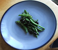 Jaguar would love thisThis recipe is from my mother, who learned it from her mother. When I eat it I think of two women I love. Mom, and Jaguar. About 2 cups Roma beans (These are an Italian green bean, flat and yummy. If you can’t find them or you don’t grow them, use regular green beans, fresh not frozen.)1 can black olives, crushed through your fingers. (That part is fun.)3 cloves garlic, put through a garlic pressAbout a cup of fresh mint, chopped fineOPTIONAL: About three quarters of a cup of small cubed potatoes, boiled. This is optional because you know the rule: PLAY WITH YOUR FOOD!Salt to taste, and good pepper, which I’ll explain about in the recipe.Really good Extra virgin olive oil for the pan - about a quarter cup