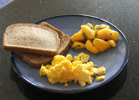 Plate GalacticaWhen the butter is melted and a little bubbly paddle it around the pan some, then pour the egg mixture in. Make sure the heat is medium low, and cover the egg pan. Leave it alone for a minute or two. No BEAKING! After a minute or two remove the cover and start scrambling the eggs about with a wooden spoon or spatula. Be gentle. Cover them again and wait another minute or two, then repeat the process.