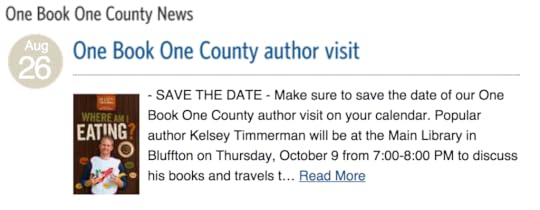 Wells County selected WHERE AM I EATING? for their One Book One County community read program. Tomorrow night I’ll be speaking at the Main Library in Bluffton, Indiana, from 7-8 PM. Here are the details.
