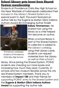 Earlier this year I was invited by the Indianapolis Public Library Foundation to speak at Providence Cristo Rey high school to celebrate the school’s inclusion in the Indianapolis Public Library system. The shelves of the school’s library were still pretty bare, but they were getting more books by the day, and the students could access any book in the entire system. But the change couldn’t been seen on the shelves, but on the faces of the students and the librarian who was almost moved to tears as she shared the story of the library and what it meant to the students.