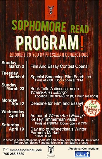 I’ll be speaking in Pruis hall about EATING? which was used as Ball State’s sophomore read this year.