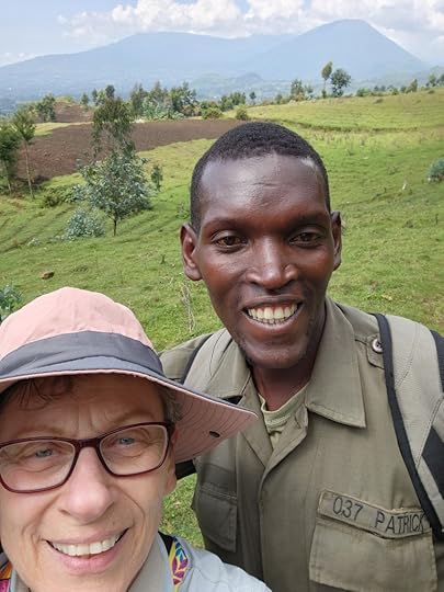 Here are Susan and her trusty porter, Patrick, trekking to see the gorillas with the volcanoes in the background. Many of the porters and trackers were gorilla poachers in the past. The gorilla hands and heads were sold as souvenirs and those animals captured alive were sold to zoos around the world. Now, these poachers can earn a good living using their skills to keep the villagers and gorillas thriving. The money earned from the steep entrance fee for us tourists ($1500) goes this local community surrounding the preserve to construct schools, clinics and market buildings. Gorilla tourism is a $445 million annual revenue to Rwanda. A Win-Win for all!