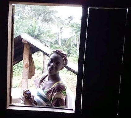 A happy woman peering through the MWH window in my village of Zorgowee in 2019.