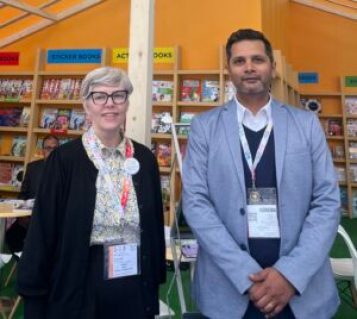 Spotlight image: Elisabeth Norton and Publisher Prashant Pathak in Wonder House Books’s booth at the Bologna Children’s Book Fair, photo by Melanie Rook Welfing.