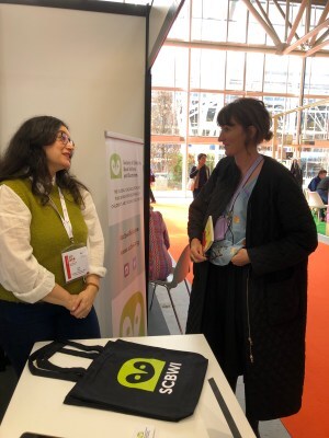 Spotlight image: Sarah Baker and Jess Racklyeft at the SCBWI booth at the Bologna Children’s Book Fair.
