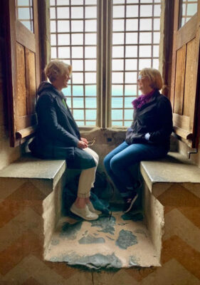 Spotlight image: Sandra Nickel and Kathi Appelt talking at the Château de Chillon in Switzerland in 2019, photo by Ken Appelt.