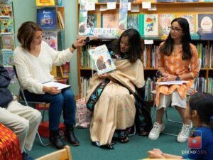 Editor’s note: Today we’re sharing a snapshot of the conversation from Cynsations Intern Suma Subramaniam‘s recent book launch for Namaste Is A Greeting, illustrated by Sandhya Prabhat (Candlewick, 2022). The chat was led by student writer Suniti Srinivasan and included author and illustrator Ellie Peterson; the conversation took place in October at Secret Garden Books in Seattle.