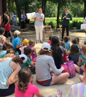 Spotlight image: Debbie Zapata reads Up and Adam, illustrated by Yong Ling Kang (Kids Can Press, 2022) with the assistance of an American Sign Language Interpreter for a group at an Austin park.