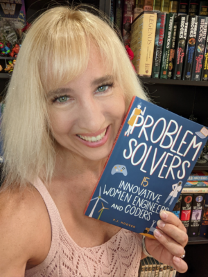 P.J. may be best known for her fast-paced adventure novels like Homer’s Excellent Adventure (CBAY, 2020), The Hidden Code (CBAY Books, 2019) and Tut: The Story of My Immortal Life (Tor/Starscape, 2016), but recently she shifted gears and wrote a nonfiction book, Problem Solvers: 15 Innovative Women Engineers and Coders (Chicago Review Press, 2022).