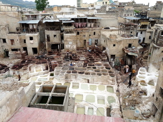 This last is of the tannery, seen from a rooftop. The smell was unbearable and we were given mint sprigs to hold over our noses. The vats take the flesh and fur off the leather, then cure it and lastly dye it. I bought a leather purse and it still smells. Any suggestions for getting out the smell? Now I need to catch up on sleep. More later.