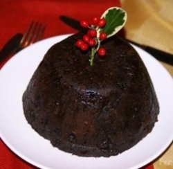 The pudding mixture is put into a basin, tied with a cloth and then steamed for hours. It is served with a sprig of holly in it. Some people pour spirits over it and bring it to the meal flaming.
