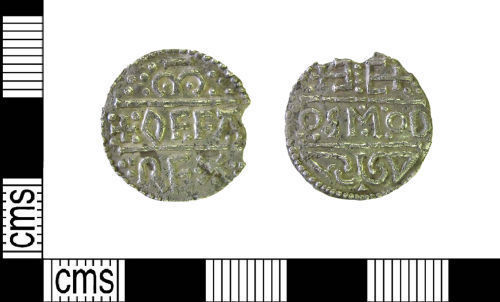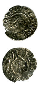 The coin I'm holding is from the reign of Offa King of Mercia, who was on the throne from 757 to 796, which makes it over 1,200 years old. It is the first British coin to be marked with the name of a king, and so is the first British coin that can be accurately dated (within about forty years, of course). It's the smallest thing, but very clearly bears the words Offa Rex on it.