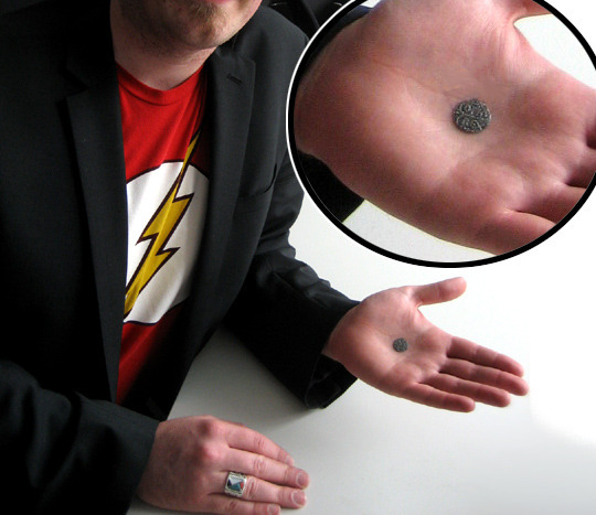 The author, with coin from Offa of Mercia's reign. It is made of silver and smaller than a 5p piece (or a dime) and thinner. It bears only Offa's name and no likeness of him, although he would appear in very intricate detail on subsequent coins.