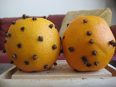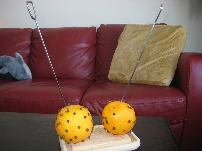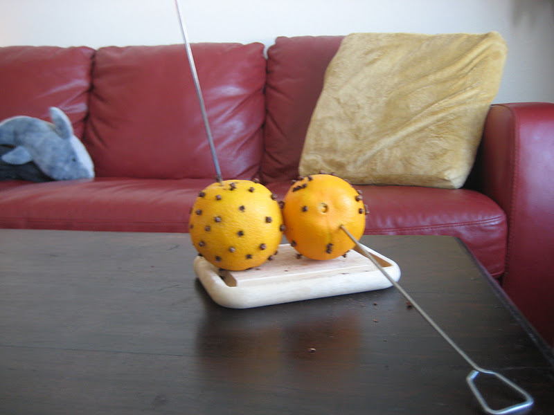 On a different note... Lil Dude and I just did a holiday craft project together. The key to engaging him in an art project is to 1) make it last no longer than three minutes and 2) involve violence of some sort. So, I decided to skewer oranges with him (which, predictably, transformed into a sword-fighting scenario). We then stuck cloves into the gouged-out holes, and ta-dah, we have fragrant little orange orbs trying to forget their traumatic past.