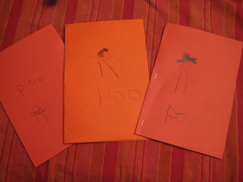 A few days ago was my 4-and-a-half-year-old Lil Dude's "Gotcha Day" -- the anniversary of the day he came home with us from Guatemala. He's been with us four crazy-wonderful years! In honor of his Gotch (his nickname for the big day), I thought I'd share with you his first literary efforts. Like his mommy, he just finished a trilogy. Unlike his mommy, he took not one year, but a single day to complete each masterpiece. Last week, I found one of these waiting for me each day in his cubby at preschool.