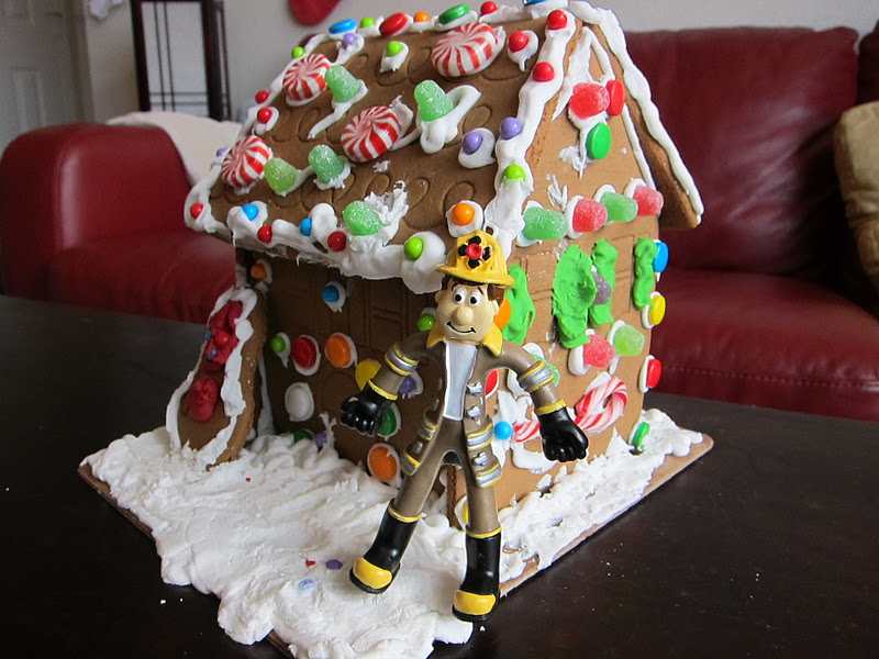When we made this gingerbread house together, he said that all those gumdrops were smoke detectors, and that candycane on the side was a hose.