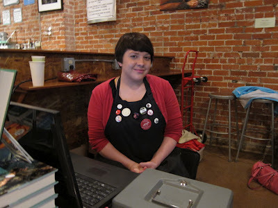 Below is Teagan selling books at the party, from Old Firehouse Books, the awesome local indie bookstore that always keeps my books well-stocked, which I'm very grateful for. (In fact, if you don't live near me, but you want to buy autographed books of mine, you can email them at oldfirehousebooks@gmail.com and see if a signed copy of the book you want is available to buy online. It probably is, since I just went in and signed a giant pile of books!)