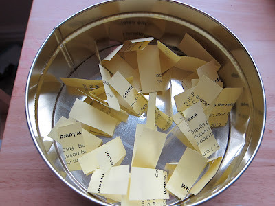 So, this morning I wrote down everyone's names on little slips of scrap paper and dropped them in a tin (one slip of paper per person, regardless of number of comments, to be fair :).