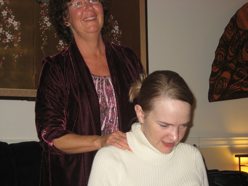 Here's Victoria Hanley, brilliant fantasy author and woman of many talents, giving Amy (who's a new mom) a much needed massage. (And then she gave me one! Heaven!)