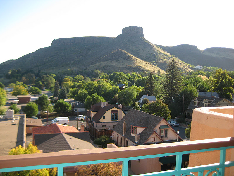 I lived in Golden for a summer when I was about 20-- I worked at a restaurant downtown which required that I dress like a cowgirl. I remember reading lots of mythology collections from all over the world that summer, and writing lots of short, fantastical stories. I loved hanging out in a little park by a dragon sculpture, writing in my notebook. This trip brought back good memories of my summer there... here's the view from my hotel patio... so pretty: